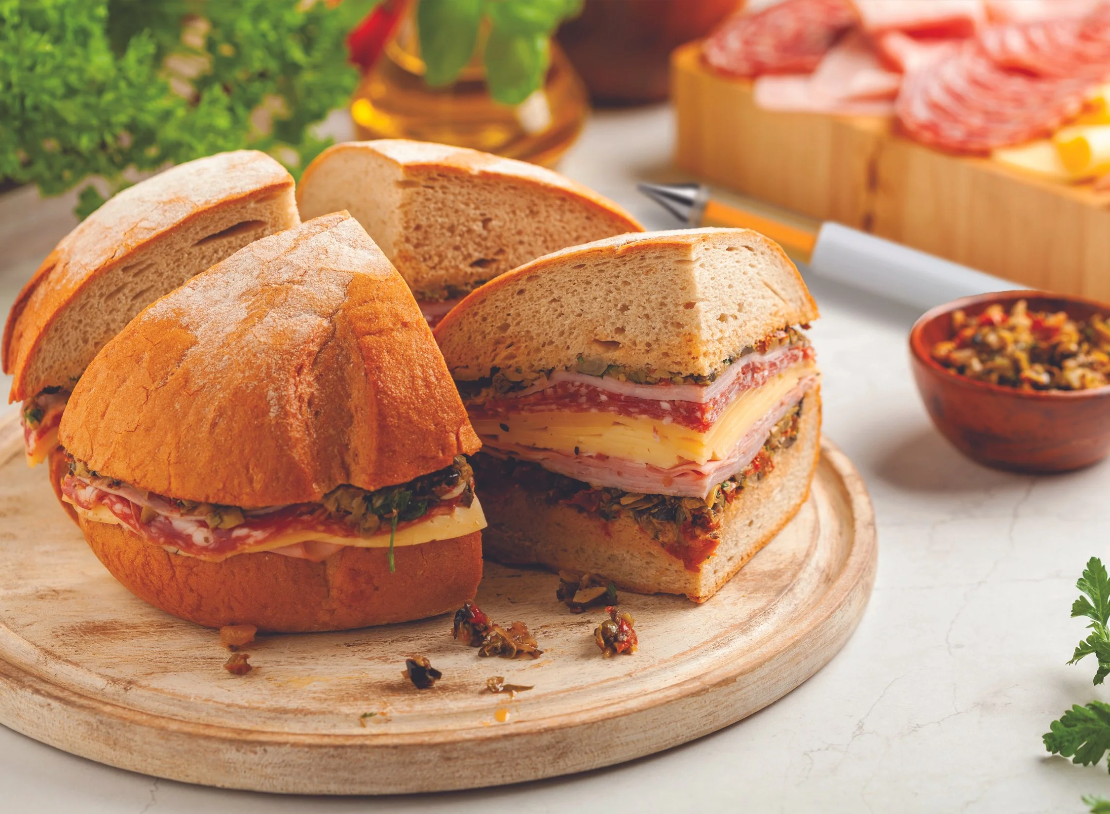 Split muffuletta roll in half and spread each half with a generous amount of olive salad. Layer half of the soppressata, half of mortadella, half of capicola, and half of the provolone on the bottom half. Repeat layers with the remaining meat and cheese. Close the sandwich and wrap tightly in paper or plastic and let rest for 1 hour before serving. Start low. Go slow.